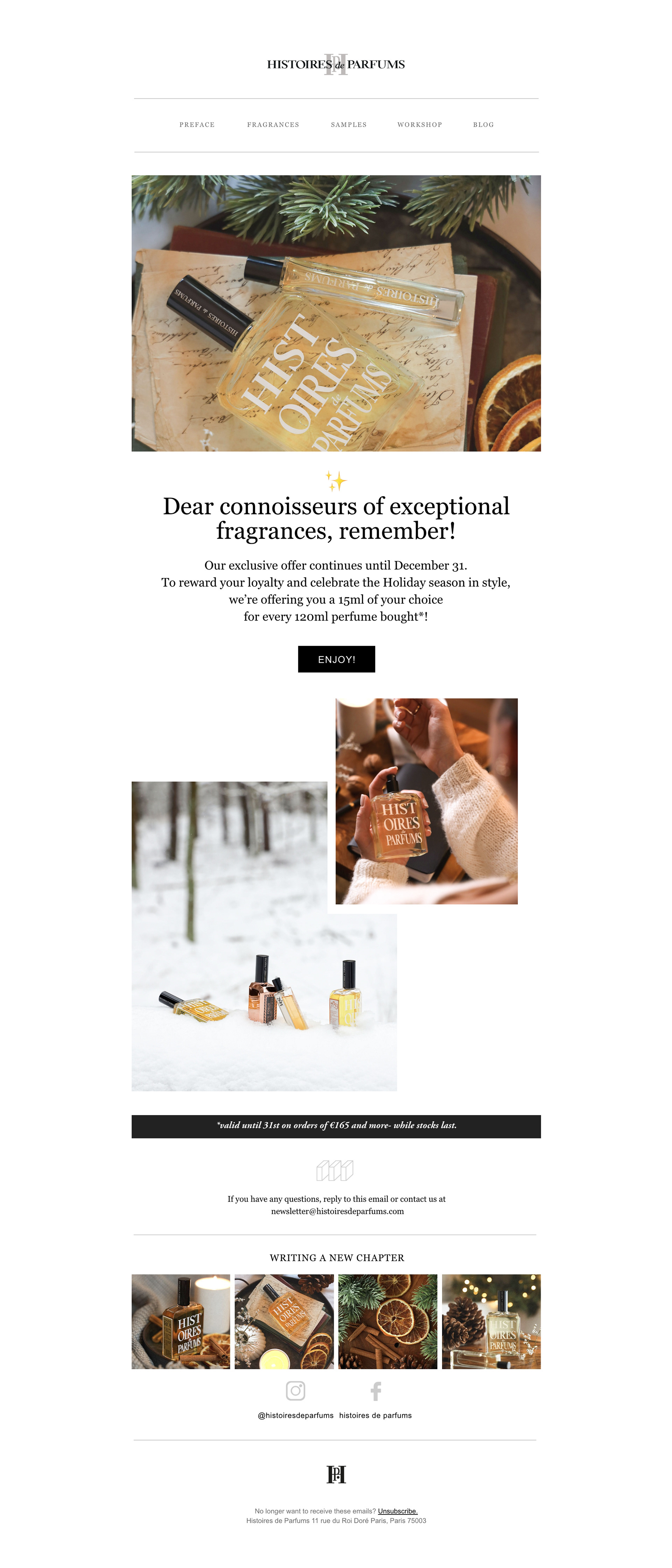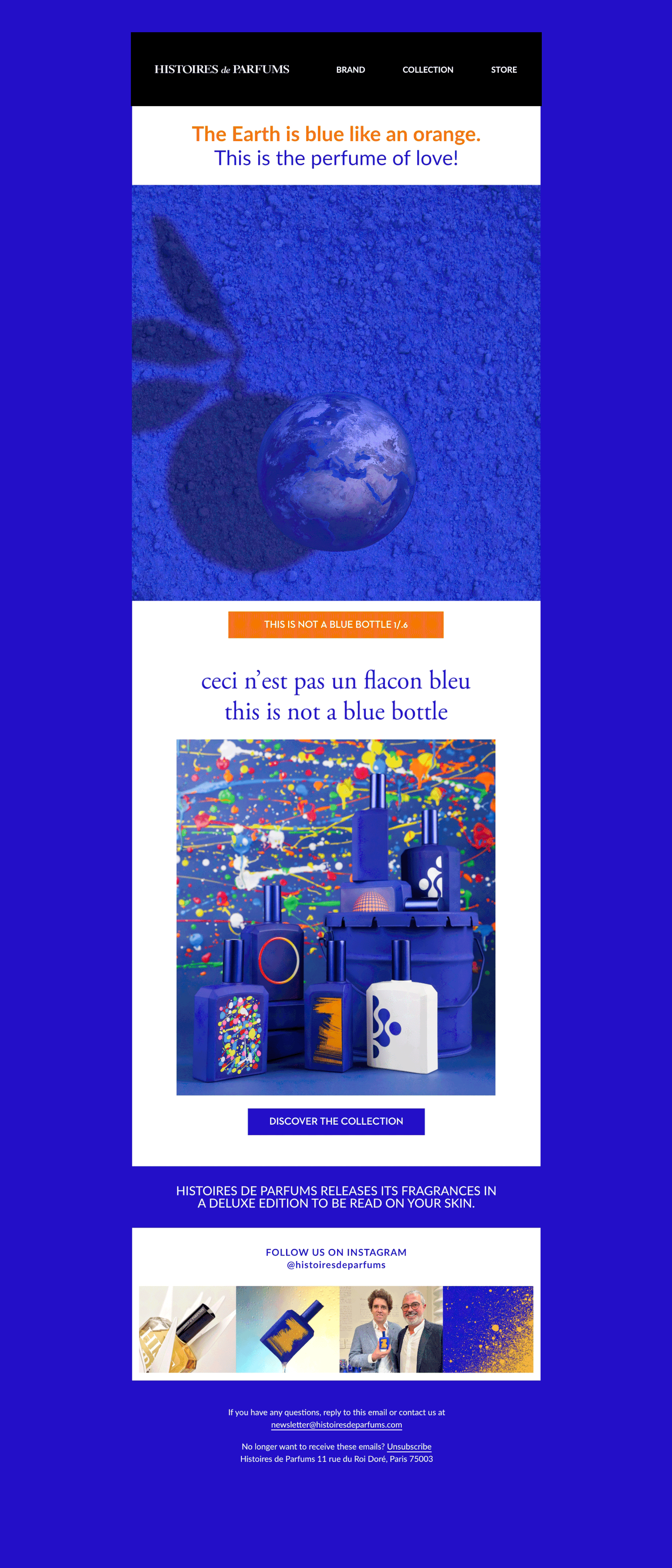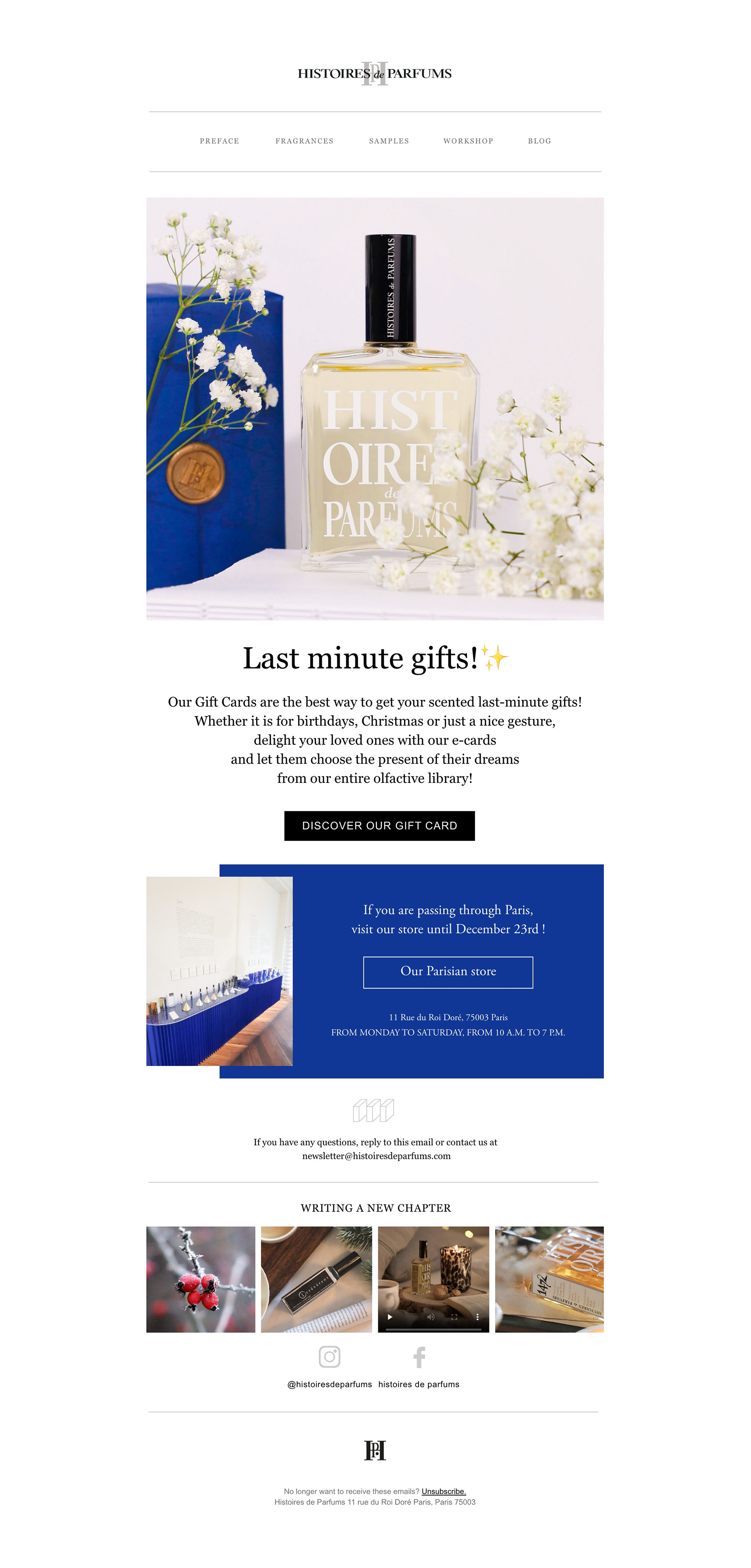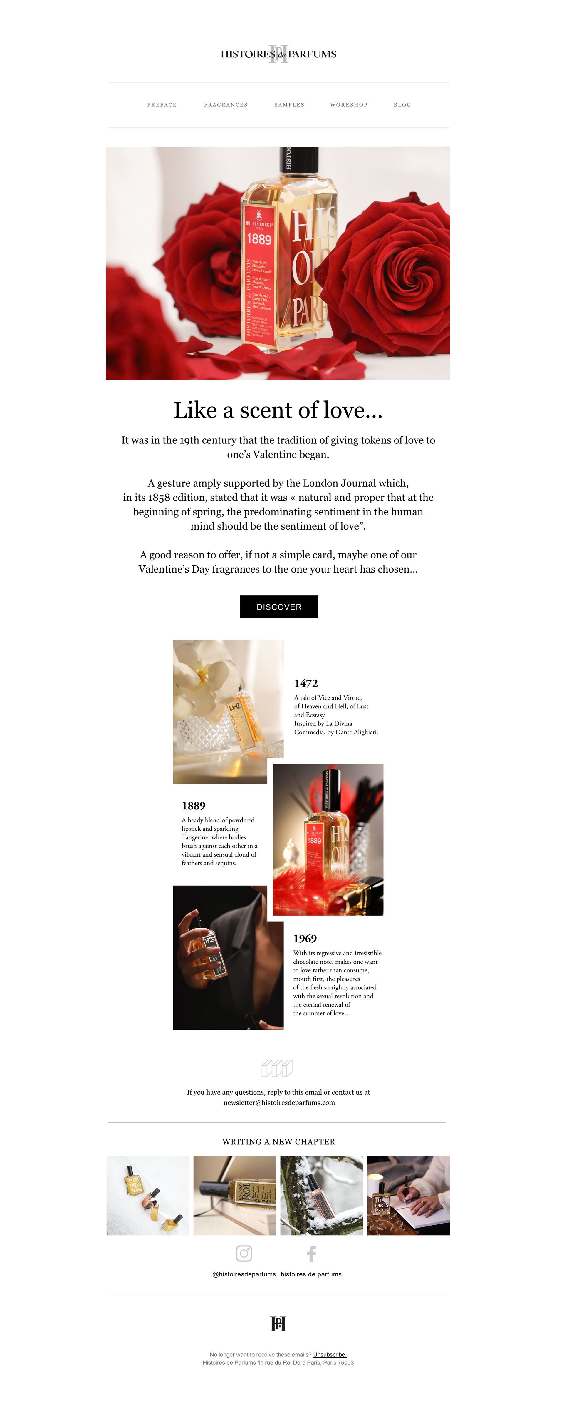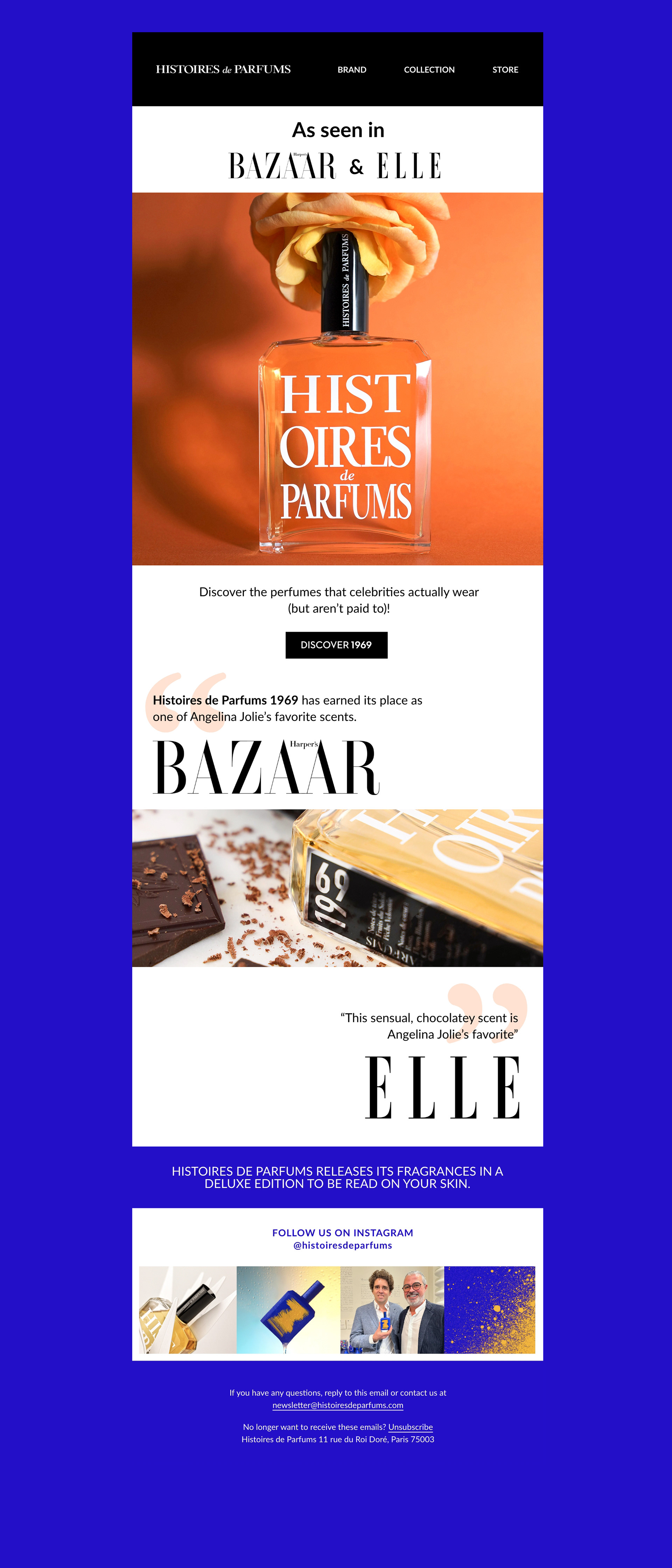 Conception de newsletters pour la Maison de parfumerie de niche HISTOIRES DE PARFUMS, dans le cadre de son ancienne et de sa nouvelle identité visuelle.