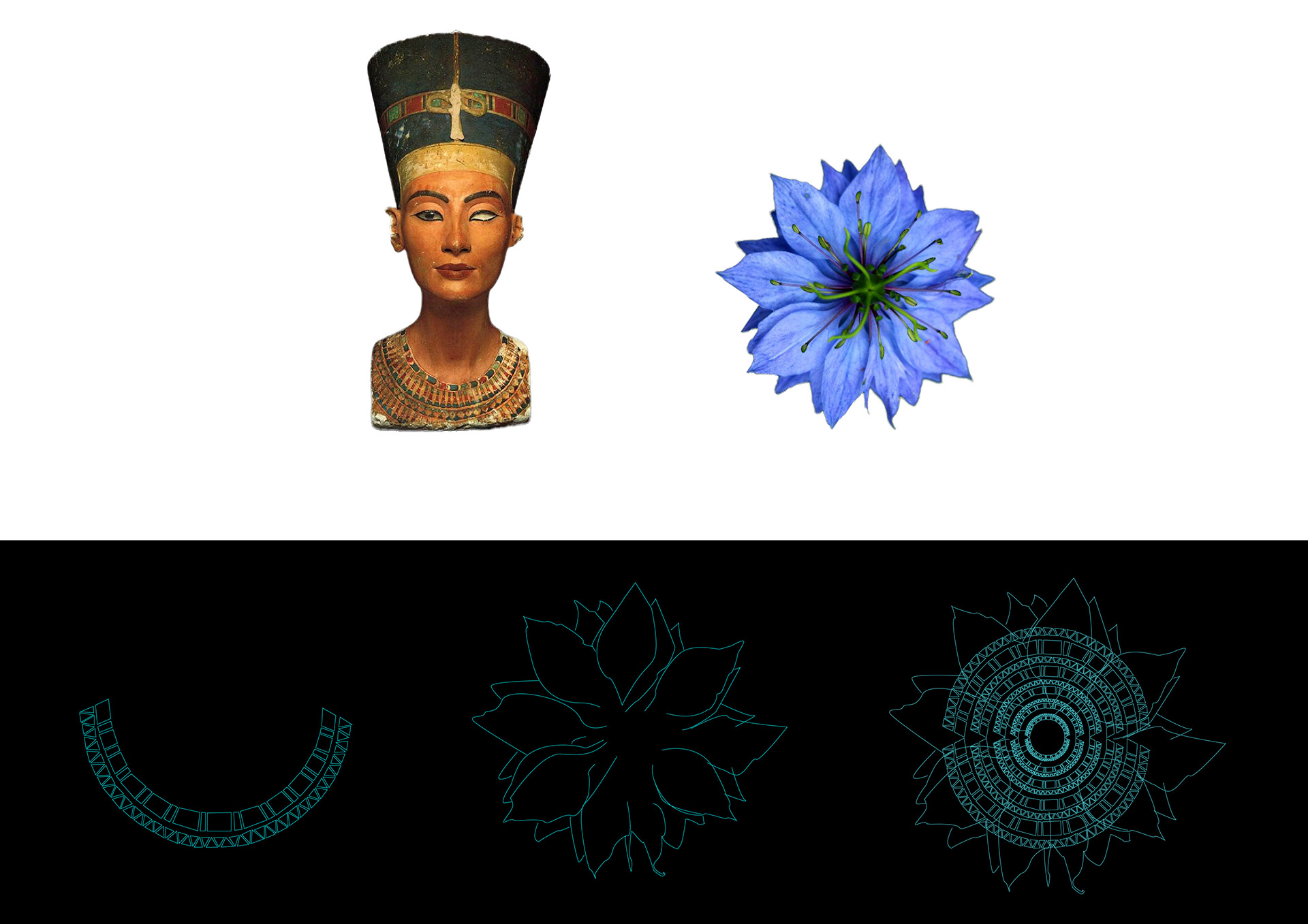 L'illustration du packaging a été pensée en reprenant les motifs du collier de la reine Néfertiti, au coeur de la fleur de nigelle.